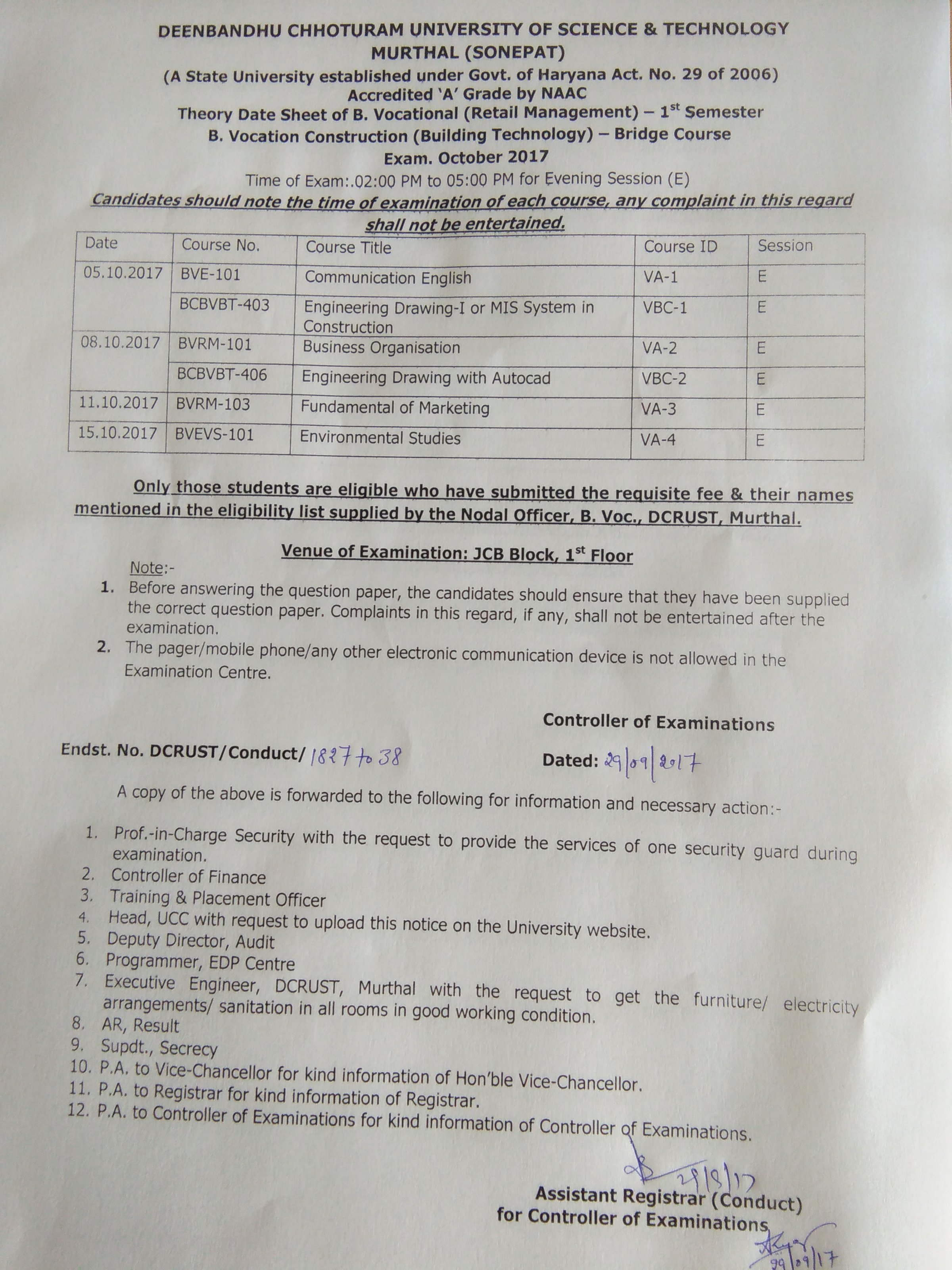List of Students - December 2025/ February 2026 Theory Examinations - The UMC Standing Committee-I meeting will be held on 17.03.2026 (Tuesday) at 10:00 am in the Spot Evaluation Centre, adjacent to the office of the Controller of Examinations, Administrative Block, DCRUST, Murthal. The students are hereby directed to appear for personal hearing alongwith their parents before the UMC Standing Committee-I. It is also intimated that, in case you fail to appear for hearing, decision shall be taken by the UMC Standing Committee-I as per UMC rules.